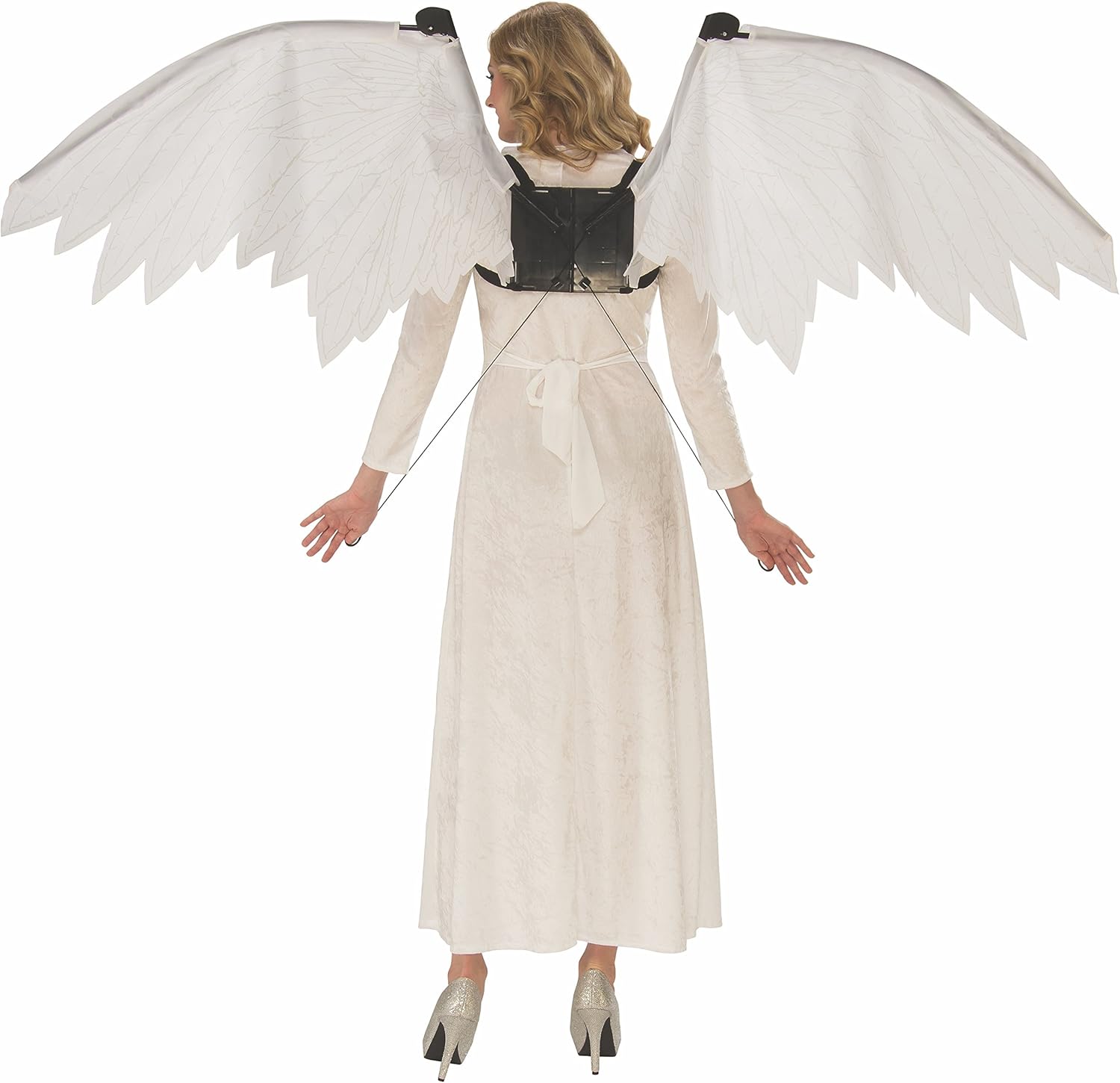 Angel white fantasy wings with movement Contracted 25" wide, when open has a 76" wing span Approximately 30" tall Plastic frame, folds for easy storage Turns whatever you're wearing into a costume
