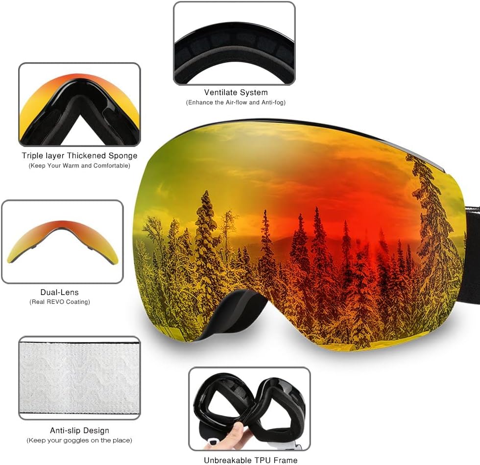 √ INNOVATIVE INTERCHANGEABLE LENS - The extra large spherical lens is secured by 12 points (8 magnets and 4 physical anchors) under a stabilization bezel to offer peripheral view and distortion-free clarity. It stays firmly while you are on the slope, but will pop out easily when lens-switch is needed. √ HELMET COMPATIBLE - Don't let biting cold spoil an otherwise great resort day, and we get you prepared: Curved and optimized frame designed for better helmet comparability. Stay in place when riding with ultimate speed on the slope. √ ANTI-FOG AND CRISP VISION - Double-layer lens design and high performance hydrophilic coating on the inner side minimize the chance of fogging. Venting windows at the top and bottom generate efficient air circulation to further ensure fog-free vision. √ ADDITIONAL FEATURES - Anti-slip silicone backed and helmet compatible strap, over-the-glasses design, triple layer foam, strong and flexible TPU frame, anti-scratch and impact-resistant lens; medium-to-large fit. √ WHAT YOU GET - one pair of Mag-Pro snow goggles, one microfiber pouch and friendly customer support. Extra lenses are sold separately. If you have any questions or comments, please don't hesitate to let us know.
