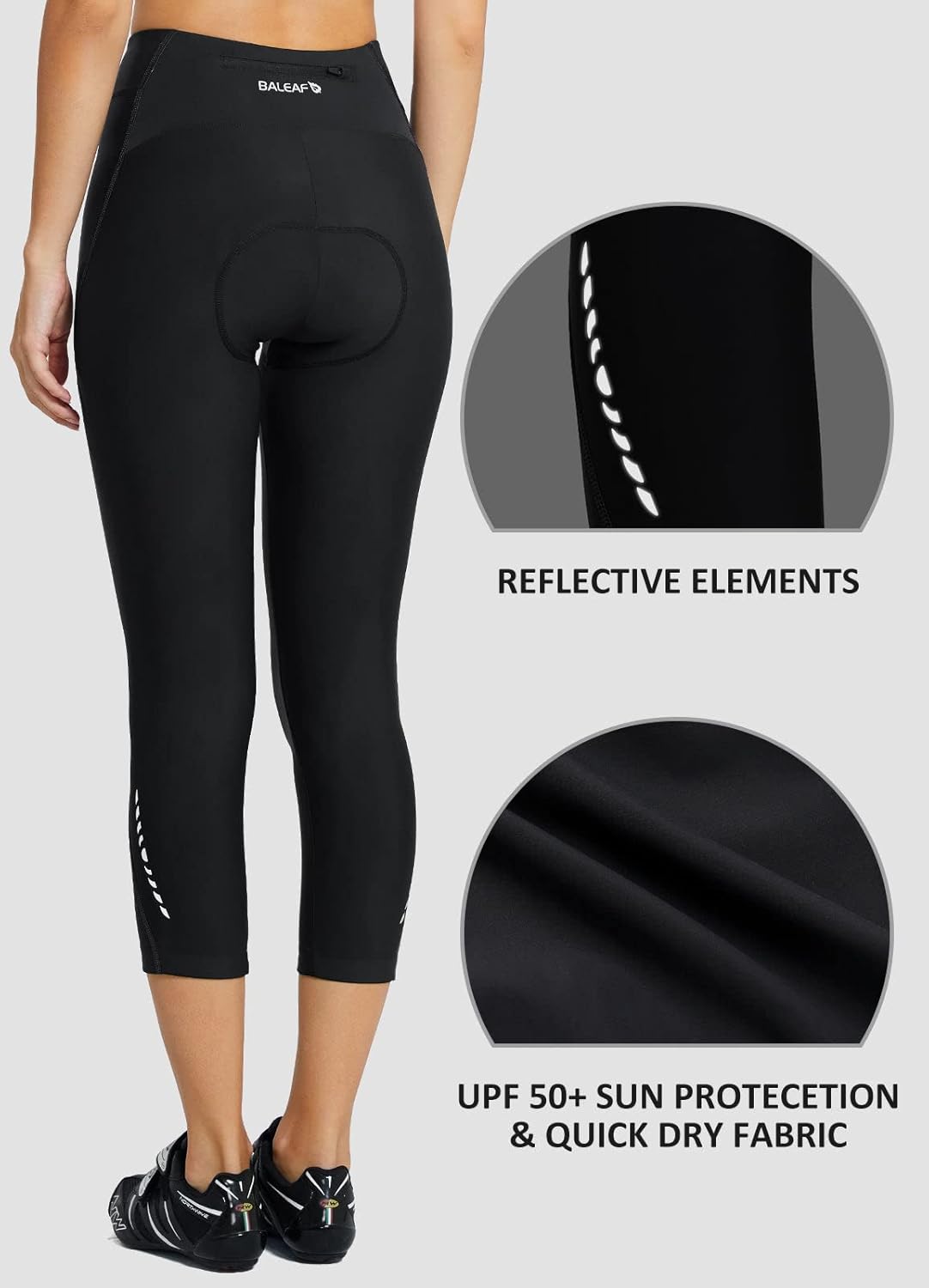 80% Nylon, 20% Spandex NOTE: If you prefer loose comfort, please order a size up/ elastic closure Breathable Fabric - Padded bike pants made of moisture-wicking fabric breathes well and keeps you dry and cool. Leg grippers with silicone dots inside keep shorts from riding up 3D Gel Padding - Women bike pants with multi-density lightweight chamois shape your hip perfectly, alleviates vibration on long rides Wide Waistband - Biking capris with arc-shaped and high wide waistband enhance tummy control and adds great comfort Utility Pocket - Back pocket with zipper for storing small items. Cycling pants with reflective elements for low-light visibility Multi-Functions - The 3/4 women biking pants perfect for cycling bike, spinning, road bike or indoor outdoor bicycle enthusiasts